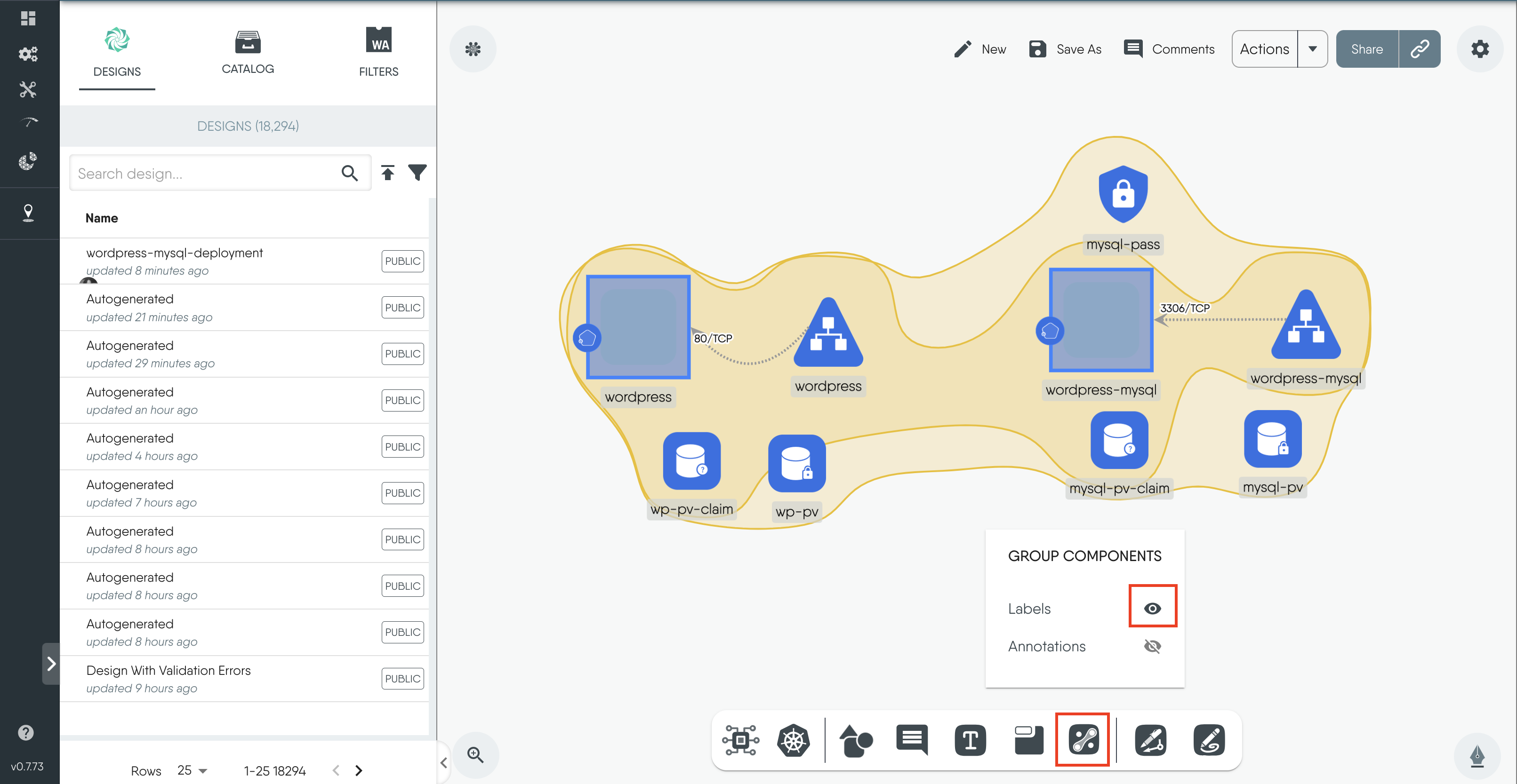 The Group Components icon on the dock below allows you to group resources based on shared labels or annotations.